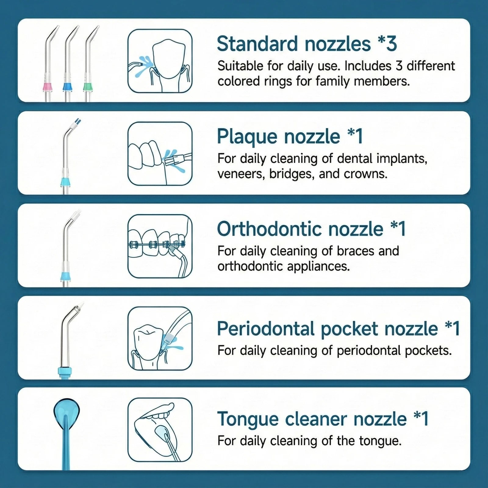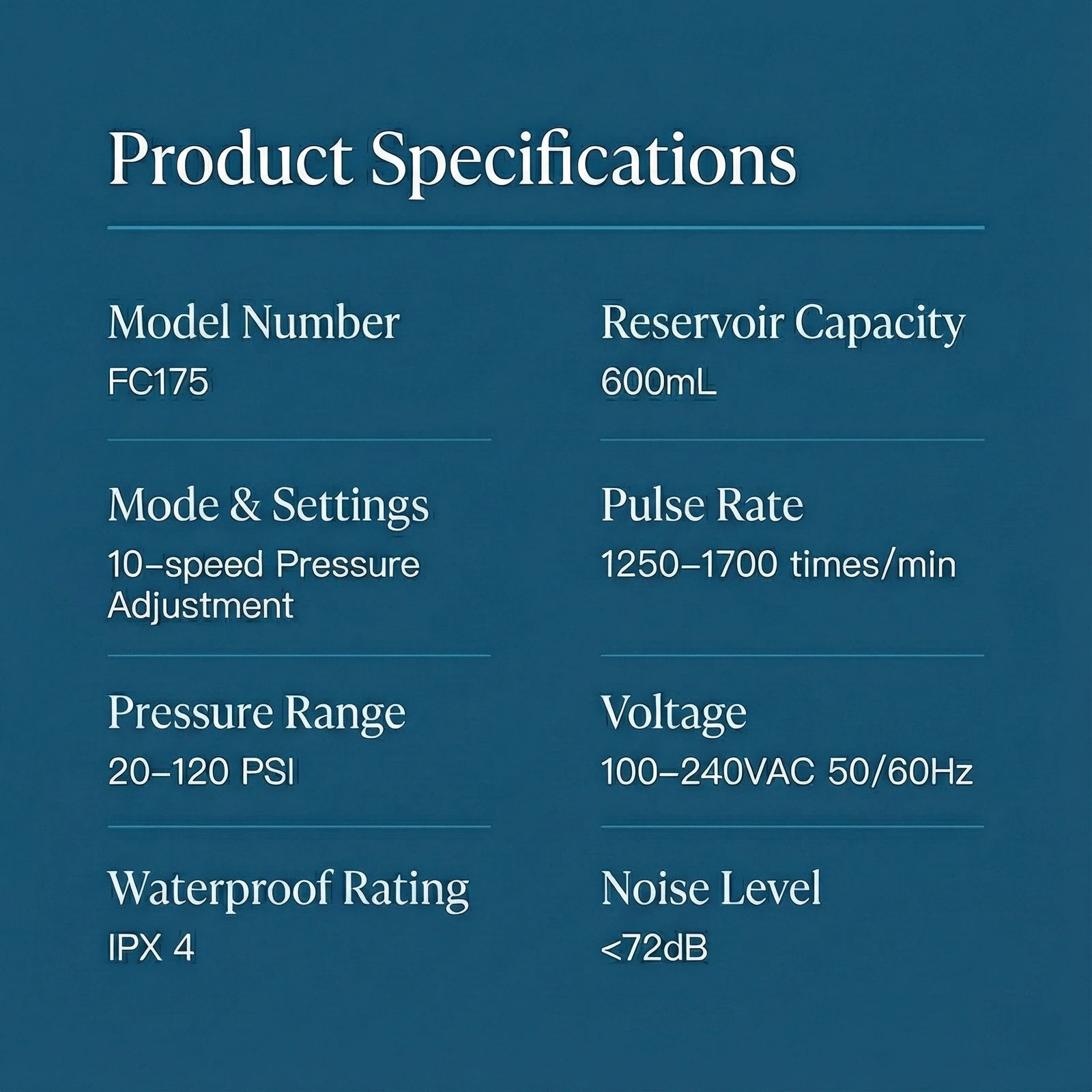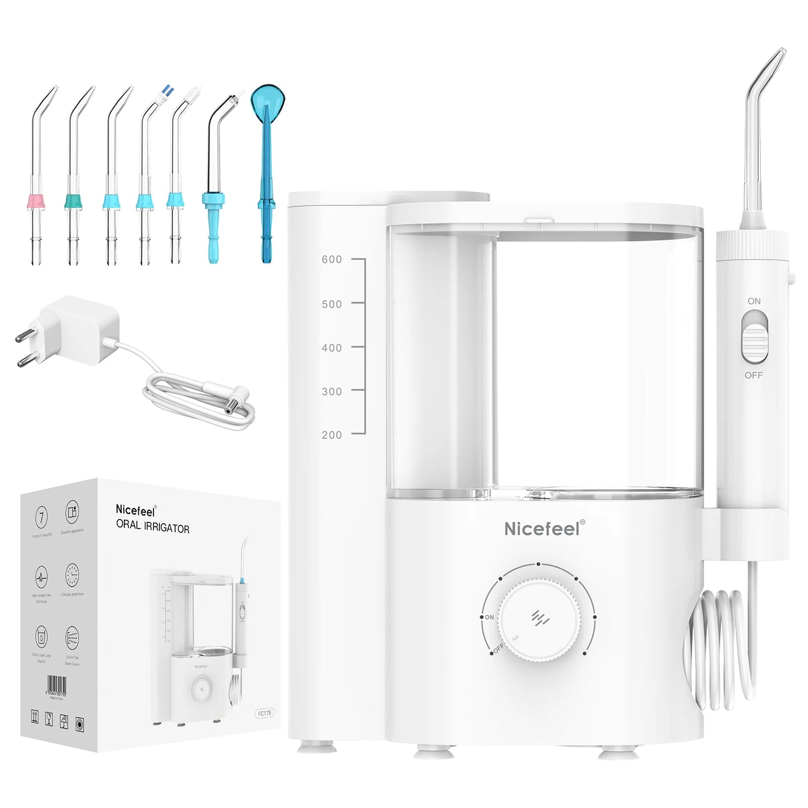 The FC175 is a family-friendly counter-top oral irrigator/water flosser with useful accessories. Its large 600ml tank means fewer refills. Made by Nicefeel, it offers 10 pressure settings for effective cleaning and gentle gum care, reaching around braces and orthodontic devices. It runs on electricity and includes 7 nozzle tips for easy, customizable dental care. It meets important quality and safety standards for reliable use.