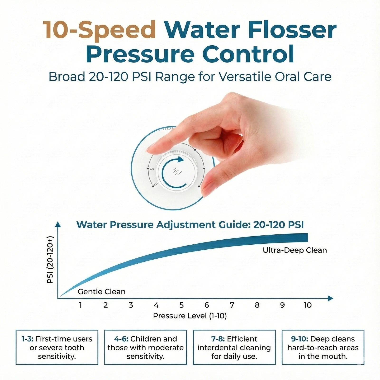 Offers 10 water pressure settings to suit different comfort levels and dental needs, including sensitive gums.